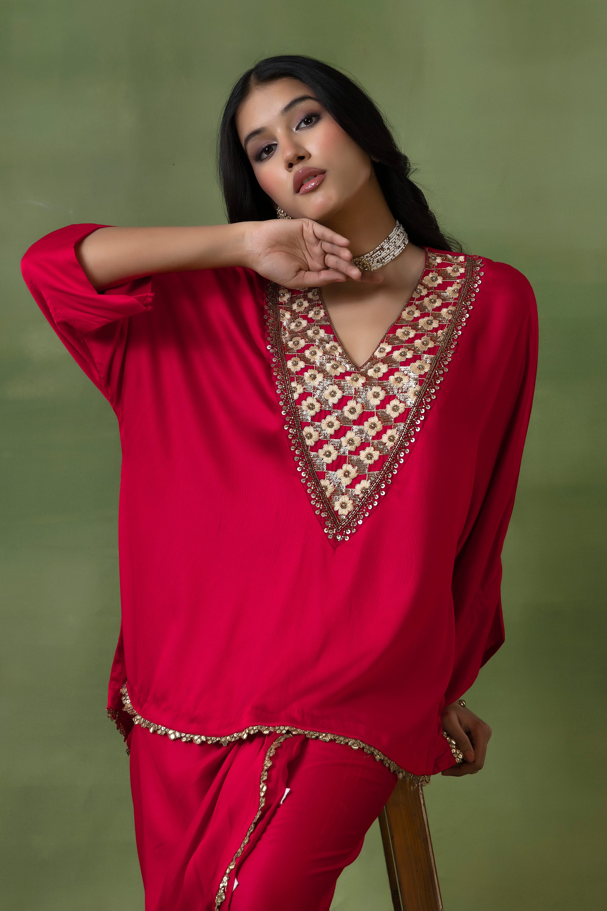 Crafted in rich red satin silk, this skirt set is adorned with intricate hand embroidery and finished with delicate lace details for an elegant, feminine touch. A perfect blend of tradition and sophistication, it’s ideal for festive celebrations, weddings, and special evening occasions.