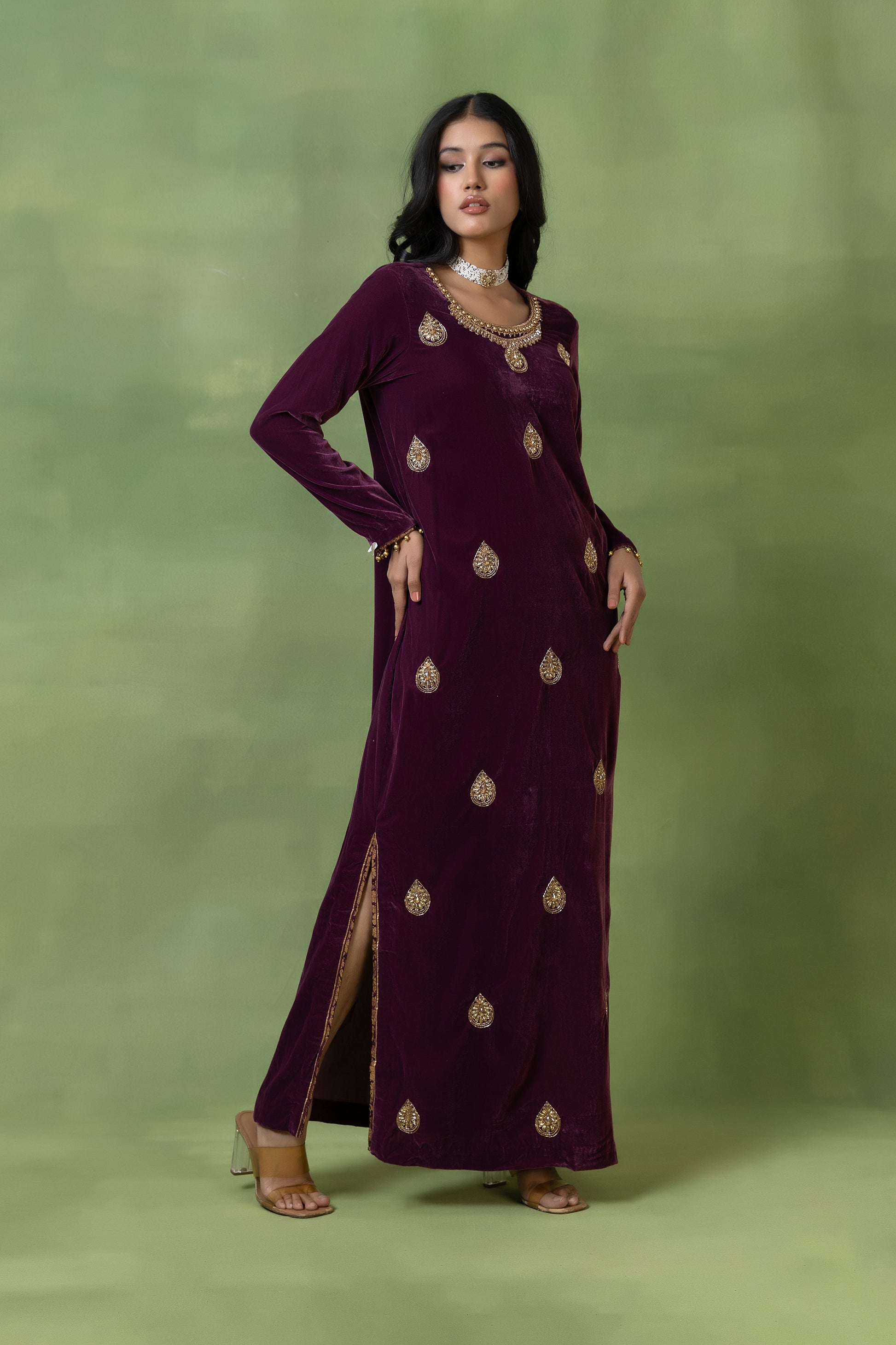 Draped in luxurious maroon velvet, this gown is exquisitely hand-embellished to create a rich, regal allure. Designed to make a statement, it blends opulence with elegance—perfect for grand celebrations, evening soirées, and unforgettable occasions.